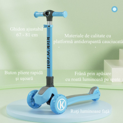 Trotineta pliabila Kick`n`Roll S7 cu roti luminoase albastra Noul model Kick`n`Roll S7 este o trotineta cu trei roti, moderna, solida, astfel incat sa asigure distractie pe termen lung. Este propulsata de forta picioarelor micului atlet, dezvoltand astfel echilibrul, conditia fizica si coordonarea. Platforma imprimata antiderapanta si cele 2 roti late din PU cresc stabilitatea si permit manevrarea trotinetei cu usurinta. Rotile din fata surprind prin dimensiunea mare (120x50mm) si includ Led-uri luminoase. Caracteristici: Ghidonul este pliabil si are inaltime reglabila de la 67 la 81 de centimetri; Pentru a schimba directia, virarea se face prin balansul ghidonului dreapta - stanga; Produsul este recomandat copiilor cu varsta de peste 3 ani; Dimensiune platforma aprox: 32 x 15 cm; Greutate recomandata: 50 kg Impachetare: Fiecare trotineta este livrata intr-o cutie de carton colorata imprimata cu brandul Kick`n Roll si alte detalii despre model. Aceasta cutie este apoi ambalata intr-o a doua cutie de carton normala, astfel incat sa protejeze trotineta si cutia originala de orice deteriorare sau socuri in timpul livrarii. Dimensiunea cutiei este de 30.5x16.8x61 cm. Cu atentie si grija, fiecare trotineta este impachetata astfel incat sa ajunga la tine in perfecta stare. Cutia colorata si imprimata cu brandul nostru iti ofera o prima impresie frumoasa a produsului, in timp ce cutia exterioara asigura protectia corespunzatoare a produsului in timpul transportului. Astfel, poti fi sigur ca trotineta ta va fi livrata intr-o stare perfecta pentru ca tu sau copilul tau sa te bucuri de ea imediat ce o primesti.