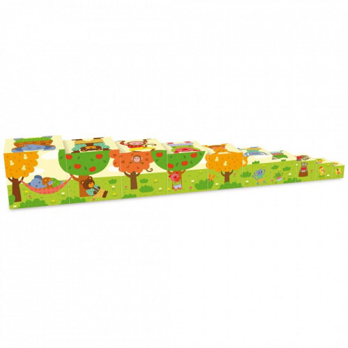 10 cutii din carton, ce intra una in alta si se pot transforma intr-o piramida amuzanta. Pe cele 4 fete laterale sunt reprezentate animale, culori, cifre, fructe si legume. Pe orizontala se poate compune o poveste. Inaltime totala: 87 cm