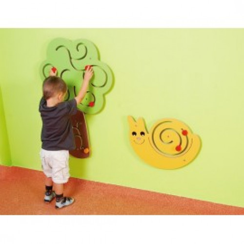 Labirint pentru fixare pe perete, in forma de melc • Caracteristici: - fabricat din MDF colorat, cu grosimea de 12mm - elemente mobile de diferite forme, din lemn - prezinta gauri pentru a fi montat pe perete - ideal pentru exercitii ce dezvolta dexteritatea manuala si coordonarea mana – ochi - dezvolta perceptia si imaginatia - poate fi utilizat pentru a recunoaste forme, culori, si a indentifica elementele similare - livrat in ambalaj de carton pentru a preveni deteriorarea in timpul transportului • Elemente senzoriale: - elementele mobile vor fi deplasate de-a lungul curburilor. Este un material educativ excelent pentru dezvoltarea dexteritatii mainii, ce ii va ajuta pe copii sa invete miscarile necesare pentru a scrie sau a desena. Aceasta activitate are rolul de a dezvolta coordonarea celor doua emisfere cerebrale, ceea ce ajuta la dobandirea cunostintelor si abilitatilor. Este un ajutor excelent pentru copii cu dificultati la citire, depasirea dificultatilor de dislexie si disgrafie. • Dimensiuni: 52 x 44 cm.