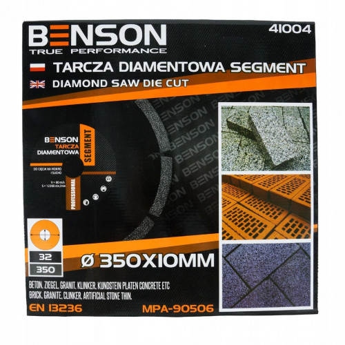 Disc diamantat destinat taierii materialelor dure precum beton , pavaj, granit, beton armat , marmura, caramizi, clincher, beton celular si altele. Pentru lucru umed si uscat. Parametrii Diametrul discului O - 350 mm Diametru gaura O - 25,4 mm Inaltimea segmentului - 10 mm viteza maxima periferic - 80 m/s