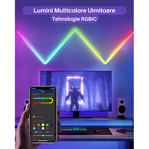 Personalizare Formei Unice : Creeaza-ti forma personalizata folosind barele RGBIC pentru a obtine o iluminare care sa se potriveasca stilului tau si spatiului tau. Culori Multicolore Uimitoare : Datorita tehnologiei RGBIC, aceste bare LED pot afisa pana la 76 de culori simultan si un total de 16 milioane de culori, oferindu-ti posibilitatea sa creezi combinatii de culori spectaculoase. Reactie la Muzica Ta : Aceste bare reactioneaza la muzica ta in 12 moduri diferite, sincronizandu-se cu ritmul si tonurile muzicii pentru a aduce o experienta vizuala dinamica si captivanta. Scene Dinamice Variate : Cu peste 64 de moduri de scene dinamice de lumina din care sa alegi, ai posibilitatea de a schimba complet atmosfera din incapere cu o simpla atingere. Descopera scene cu miscari multicolore inspirate de diferite emotii, elemente naturale si activitati de zi cu zi. Calitate Robusta si Fiabila : Fabricate din plastic ecologic ABS, aceste bare sunt cunoscute pentru durabilitatea si fiabilitatea lor. Designul lor permite demontarea directa, eliminand preocuparile legate de fragilitate. Procesul de instalare este simplu si eficient.