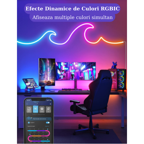 Control Inteligent prin Aplicatie si Voce : Poti controla aceasta banda LED prin aplicatie si cu ajutorul comenzilor vocale, oferindu-ti flexibilitate maxima in ajustarea culorilor si efectelor. Personalizare Totala a Camerei : Aceasta banda LED iti ofera posibilitatea de a personaliza complet atmosfera din camera, permitandu-ti sa alegi culorile si efectele care se potrivesc cel mai bine cu stilul si preferintele tale. Sincronizare cu Muzica : Luminile se sincronizeaza cu muzica, schimbandu-si culorile si efectele in functie de ritmul si tonurile muzicii, aducand o experienta de lumina captivanta in timpul auditiei muzicale . Programare Automata : Poti programa banda LED sa se aprinda sau sa se opreasca automat la ore prestabilite, facandu-le ideale pentru a servi ca iluminare de trezire sau stingere automata in functie de rutina ta zilnica. Instalare Simpla : Montarea este usoara si intuitiva, astfel incat poti incepe sa te bucuri rapid de iluminare. Nu sunt necesare abilitati tehnice complexe sau instrumente speciale pentru instalare.