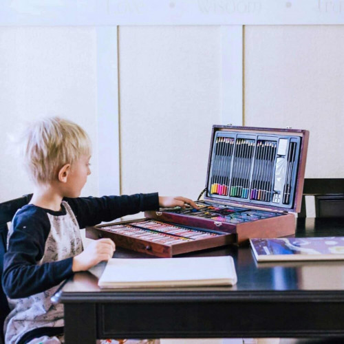 Set 142 piese pentru pictura, pentru copii sau adulti, pixuri de colorat, creioane colorate si vopsele de pictura, cu geanta de transport din LEMN MASIV, model AVX-WT-INGRES142