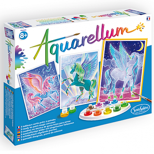 Aquarellum Junior se bazeaza pe tehnica sertisajului pe hartie velina care lasa acuarela sa adere doar in spatiile rezervate: motivele apar pe masura ce pensula aluneca pe plansa si pot fi repictate pana la obtinerea armoniei perfecte. Aceasta activitate artistica este ideala pentru a-i invata pe copii sa compuna culorile. In plus, ea stimuleaza imaginatia, concentrarea si precizia. Contine : - 3 Tablouri - 9 Culori - 1 Pipeta - 1 Pensula - 1 Paleta Varsta recomandata: 8 ani +