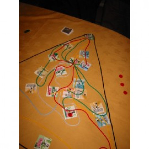 Joc String Railway Jocul String Railway este un joc unic cu trenulete care e format din fire colorate, tokene, tile-uri de statii si o placa pentru scor. Pentru a incepe jocul, se pune pe masa firul legat de cerc pentru a stabili aria de desfasurare a jocului; dupa se pune un mic cerc format din fir pentru a reprezenta un munte si un fir pentru a reprezenta un rau. Acum se plaseaza statiile principale a jucatorilor la distante egale. Pe tura tragi si plasezi un cartonas, dupa care incerci sa plasezi un fir de tren intre statiile tale. Statiile care sunt conectate aduc puncte de victorie. Dupa cinci ture, jocul se termina si jucatorul cu cele mai multe puncte castiga. Jucatori: 2,3,4,5 Durata: 30 min Complexitate: Mica