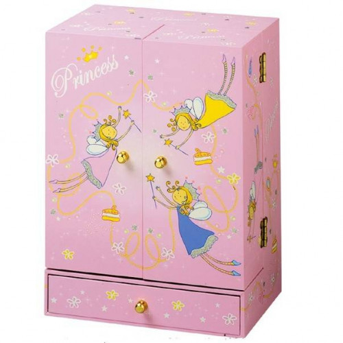 Un dulapior muzical de mari dimensiuni, cu 3 sertare si spatii pentru inele, in care fetitele isi vor putea pastra bijuteriile si comorile personale. Pe cele 2 usi se gasesc cate 2 carlige pentru a putea agata coliere. Cutiuta este din lemn si e acoperita pe exterior cu hartie imprimata. La interior, materialul este catifelat, iar figurina este din plastic. Odata cheita invartita, mecanismul muzical va actiona rotirea printesei. Melodie: MENUET - W.A. MOZART. Dimensiune: 13 x 17.5 x 25 cm O CUTIE DE MUZICA PENTRU PASTRAREA BIJUTERIILOR: Luand forma unui dulap, aceasta cutie mare de bijuterii muzicale va uimi o tanara fata care isi va depozita bijuteriile si secretele acolo. In ceea ce priveste cei mai in varsta, acest dulap este dotat cu sertare, liant cu inele si suport pentru colier. Infasurati cheia si figurina Printesa prinde viata ca prin magie la sunetul muzicii! IDEAL DE LA NASTERE: Acest set de cutii muzicale va arata grozav pentru a decora camera copilului. TREZITI-VA COPILUL: Introduceti-i pe cei mici in muzica clasica cu cantecul lui de leagan dulce inspirat din „Minuetul” lui Mozart. Figura Printesei se intoarce catre sunetul muzicii. CADOU FARA TIMP: O cutie muzicala este un obiect atemporal care este pastrat cu atentie ca simbol al copilariei. Melodia ei si amintirile care o insotesc vor ramane mult timp gravate in memoria copilului. TROUSSELIER - Printesa - Dulap mare cu cutie de bijuterii muzicale - Cadou ideal pentru o fata tanara - Muzica Minuet de Mozart - Culoare roz.