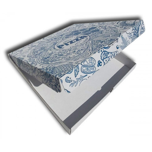 Set 100 cutii de carton, pentru pizza, 300x300x35 mm, Alb, cu design albastru