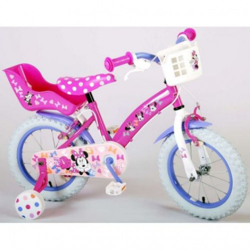 Bicicleta pentru copii Disney Minnie 14 inch.Bicicleta pentru fete Disney Minnie Mouse este extrem de populara la toate fetele.Bicicleta are un scaun de papusa in spate si un cos de plastic in fata, astfel incat fiecare fata sa isi poata lua lucrurile cu ea, dar sa isi tina mainile in siguranta pe ghidon. In plus, bicicleta are aparatoare de lant inchisa.Bicicleta este echipata frana de mana pentru roata fata si frana de mana pentru roata spate, cauciucuri albe, jante metalice.Pentru a invata cum sa pedalezi rapid, bicicleta are doua roti laterale detasabile. Ce fata nu si-ar dori aceasta bicicleta? Recomandata pentru copii cu varsta cuprinsa intre 3.5 si 5 ani, cu o inaltime intre 98 la 110.Bicicleta 14 Inch Minnie Mouse este ideala pentru a invata mersul pe bicicleta.Bicicleta Minnie Mouse va creste o data cu micuta Dvs, ghidonul si saua sint reglabile pe inaltime, iar rotile ajutatotare se pot demonta.Caracteristici:roti cauciuc gonflabile ,cadru din otel.Inaltime sa de la podea - 47 cm.Produsul vine 85% ansamblat.Dimensiuni cutie 100,0 x 17,0 x 53,0 cmContraindicat copiilor mai mici de 3 ani. Jucaria/produsul poate contine piese mici care se pot inghiti sau inhala existand pericolul de sufocare sau nu este potrivita copiilor mai mici de 3 ani. Nu lasati ambalajele jucariilor/produselor la indemana copiilor. Indepartati orice ambalaj al jucariei/produsului inainte de a da jucaria/produsul copilului. Va rugam sa supravegheati copilul in timp ce se joaca/foloseste acest produs. Pastrati instructiunile si etichetele pentru referinte viitoare. Pastrati jucaria/produsul departe de foc; feriti jucaria/produsul de temperaturi ridicate si umiditate.