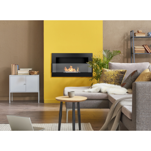 Semineu cu bioetanol suspendat 650x400, cu sticla, negru mat, de interior, incastrabil / de perete, palnie, kit de asamblare, stingator, suruburi, benzi de montaj si pietricele albe decorative incluse, 2 kW, din otel inoxidabil!