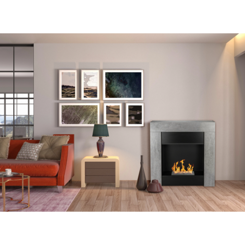 Semineu cu bioetanol LOFT, 95,4 cm x 84,2 cm x 16 cm, de interior, culoare beton, gri,freestanding, palnie, kit de asamblare, stingator, suruburi, benzi montaj si pietricele albe decorative incluse, 2 kW, din MDF lacuit si otel inoxidabil!