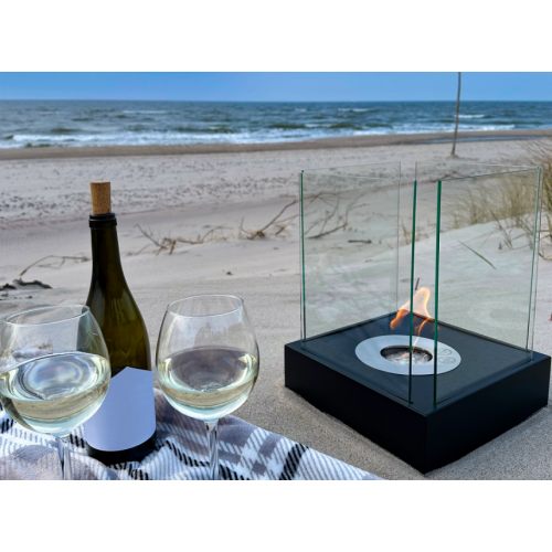 Semineu / Arzator SUNSET Garden mini, cu sticla securizata, Freestanding / de Masa, cu Bioetanol, Portabil, 26 cm x 33 cm x 26 cm , Otel, Negru, Palnie, Stingator - maner pentru stingerea flacarii si set de pietricele albe decorative incluse!