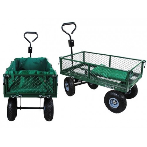Specificatii: - carucior de transport pentru curte si gradina; - husa textil; - capacitate maxima suportata 250 kg; - maner lung ce faciliteaza transportul caruciorului; - permite viraje la 180 grade; - laterale detasabile; - prevazut cu 4 roti pneumatice dd 3.5 inch; - cadru si grilaj metalic rezistent; - convertibil in carucior plat tip platforma; - dimensiuni cadru metalic 89 x 49 x 22 cm; - dimensiuni carucior 102x50x94 cm; - culoare verde. Carucior metalic de transport, laterale detasabile, maxim 250 kg Acest carucior este un accesoriu extrem de util pentru a fi utilizat in gradina sau in curte, facilitand transportarea obiectelor grele si voluminoase precum lemne, mobilier de gradina, unelte pentru gradinarit sau alte obiecte. Caruciorul este confectionat dintr-un cadru metalic rezistent si grilaj metalic, fiind solid si durabil. Lateralele caruciorului sunt detasabile astfel incat transportarea obiectelor voluminoase sa nu reprezinte o problema. Roti pneumatice, comod de folosit pe teren usor denivelat Rotile de dimensiuni mari se adapteaza usor oricarui tip de drum, iar cauciucurile pneumatice au rolul de a absorbi socurile si a reduce zgomotul. Manerul este prevazut cu o suprafata de burete antiderapant pentru o prindere ferma, iar posibilitatea de viraj la 180 grade asigura o manevrabilitate extrem de usoara.